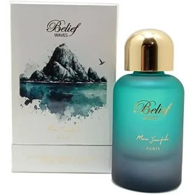 طراحی ظاهری بیلیف ویوز (Belief Waves) جذاب است. جعبه عطر همانطور که این روزها مرسوم است هاردباکسی شکیل و دو تکه است. تصویری از یک صخره در میان امواج دریا با رنگهای خنک آبی و سبز روی جعبه حس عطر را انتقال میدهد. اگر چه با توجه به نام عطر که به معنی امواج است این طراحی میتوانست متناسبتر باشد. شیشه عطر هم طراحی جالب و با کیفیتی دارد. بدنهای مات که رنگ آن از سبز روشن در بالا به سبز یشمی در پایین تغییر میکند حس خنکای عطر را به خوبی انتقال میدهد. درپوش فلزی و آهنربایی عطر هم هماهنگی خوبی با سایر اجزا دارد و نشان دهنده توجه تولید کننده به ظاهر عطر است.
